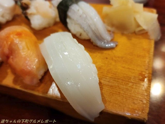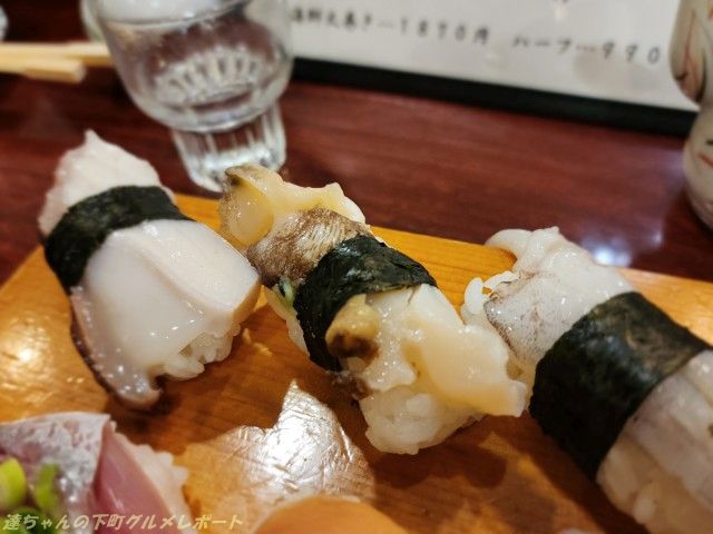 鯵、赤貝、イカ、ホッキ貝、つぶ貝、イカ下足をそれぞれ1貫づつ。